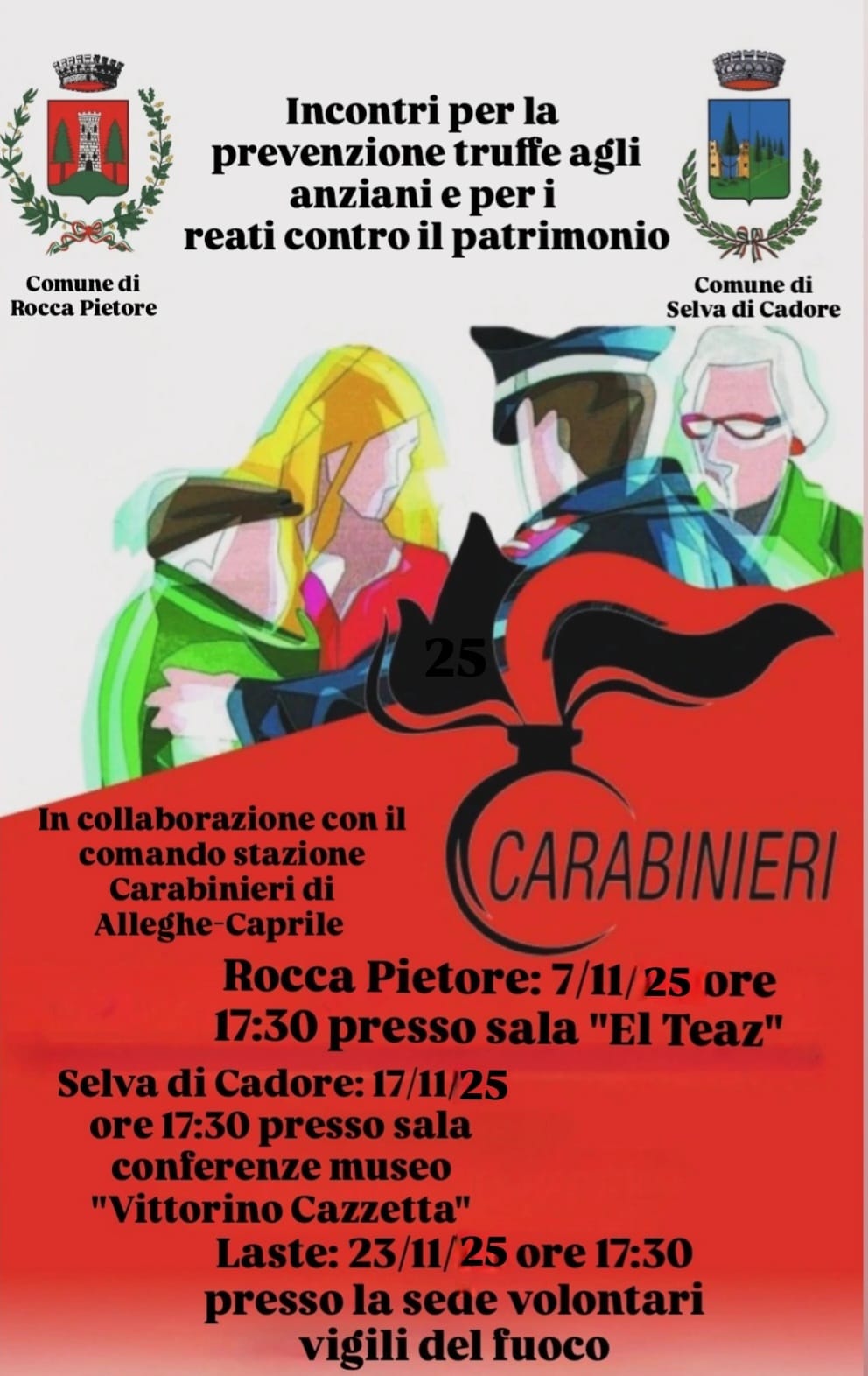 I Comuni di Rocca Pietore e Selva di Cadore, in collaborazione con il comando stazione Carabinieri di Alleghe-Caprile, hanno fissato un ciclo di tre incontri al fine di promuovere la prevenzione alle truffe ai danni degli anziani e per i reati contro il parimonio.